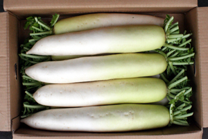 早朝3時頃から収穫された大根は、各生産者により水洗いされた後、出荷場に運び込れ、1本1本丁寧に箱詰めされます。キメが細かく、みずみずしいと大変好評な大根です。